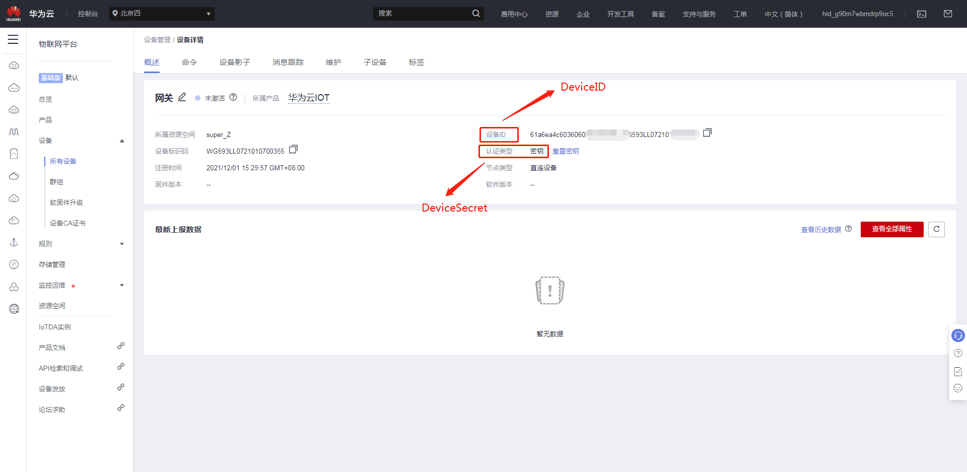 DeviceID为之前在华为云IOT所有设备上注册的设备生成的设备ID;