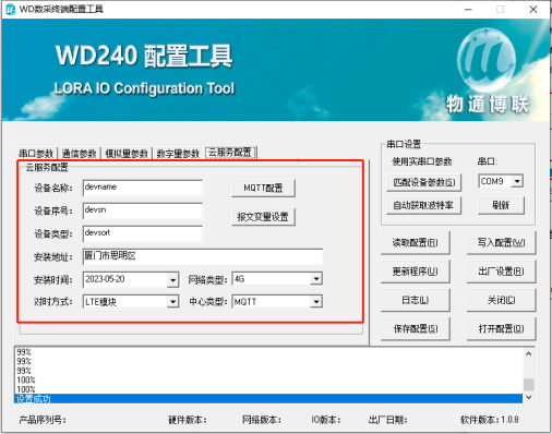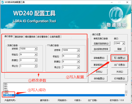 可以通过配置工具修改WD140设备的串口参数以及通讯参数(相关配置的说明请继续阅读此文档),修改完成后点击“写入配置”,等待下方提示写入成功后即可。