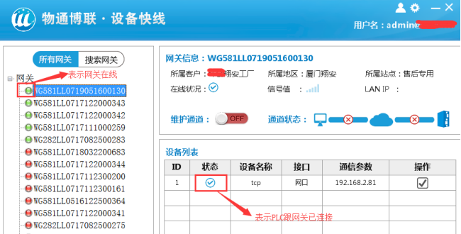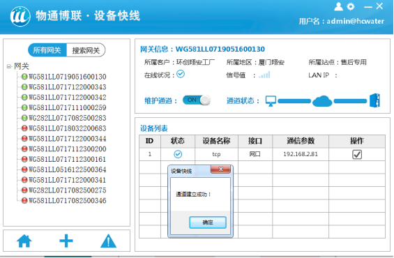通过所属客户、所属地区、所属站点以及通信参数等确认是要维护的设备,点击维护通道进行连接,如下图,也可以通过“搜索网关”搜索到要维护的网关。