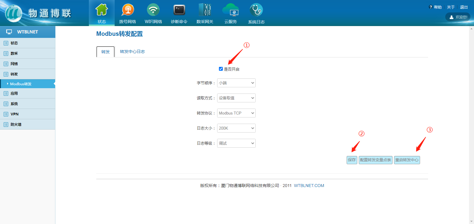 P.s.转发运行出现异常时,请将日志状态调整为“调试”,可打印具体日志,下载转发日志发送至物通博联技术支持工程师处诊断。为了保证网关快速高效转发,调试完毕后请务必将日志等级调整为信息。