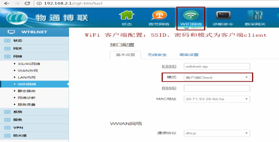 模式:客户端Client(通过WiFi上外网请选择client模式,如果是共享WiFi给其他设备请选择AP模式)
