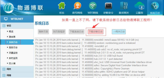 如果通过如上设置还是没办法上网,请下载诊断日志,然后发给物通博联工程师;我们工程师会根据系统日志诊断问题并提出指导建议。