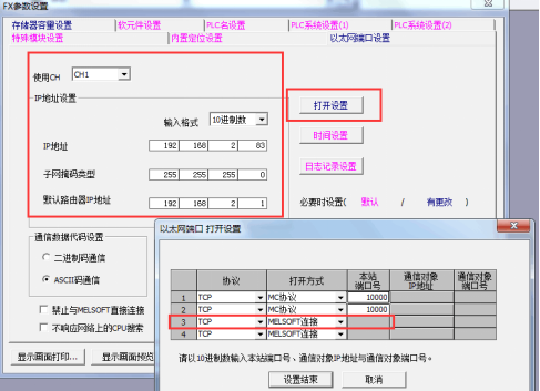 打开MELSOFTGXWorks2,通过编程口登录FX3U控制器,设置FX3U网口参数,点击“参数”——“PLC参数”——“以太网端口设置”,具体设置见下图: