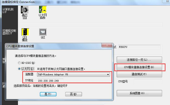 2、“CPU模式”设置,“经由集线器连接”,填写控制器的IP地址。