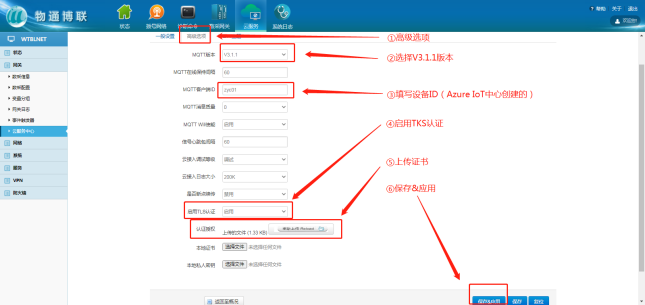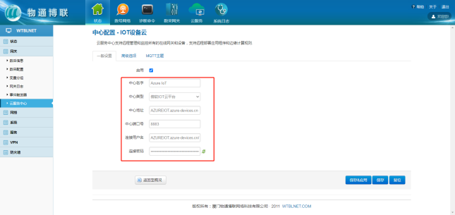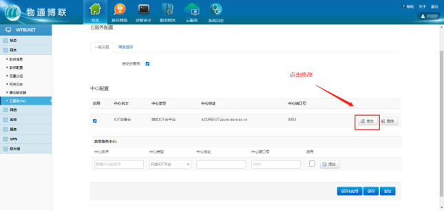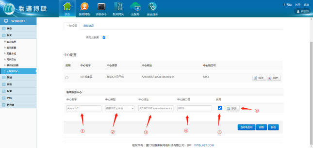 选择“微软云平台”,打开物通博联网关WEB界面,新建一个连接中心,中心类型选择微软IoT云平台,输入相应信息,勾选启用,点击“添加”