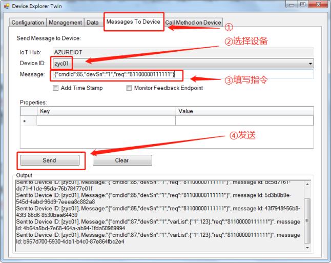 打开配置工具软件,切换到”Message To Device”选项卡,在”Message”输入框,填写要下发的消息