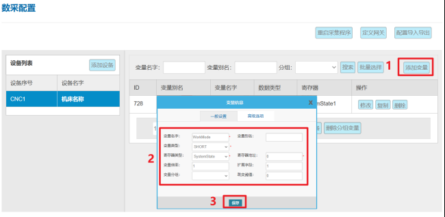 变量配置主要是定义变量名(自定义内容,不可使用中文命名)、变量别名(自定义,可使用中文名字)、寄存器类型和寄存器偏移地址,并定义一些数据规则(如:倍率、小数点、单位、告警)。
