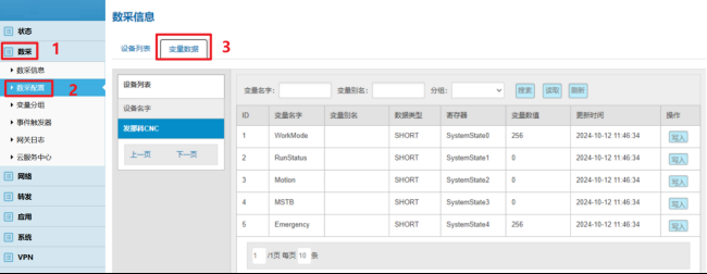 数采配置(设备信息+变量参数)完成后,重启采集程序并生效配置即可在:数采信息---变量数据---设备名称 中看到采集上来的数据。