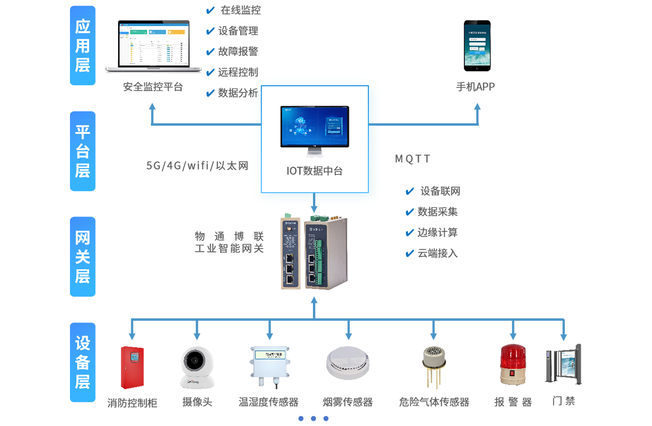 物通博联通过对生产设备、传感器、摄像头、消防设备、安防设备等设备进行联网和数据采集,将视频监控、人员行为、设备状态等各类数据进行统一调度和应用,实时监管工厂环境风险、人员行为不规范、安全着装及车辆人员闯入等问题,并自动预警、上报、联动应急指挥,有效解决传统监管难度大、人工排查易疏漏、事前预防能力差和响应慢等痛点,构建工厂智慧安监解决方案,减少安全事故的发生。
