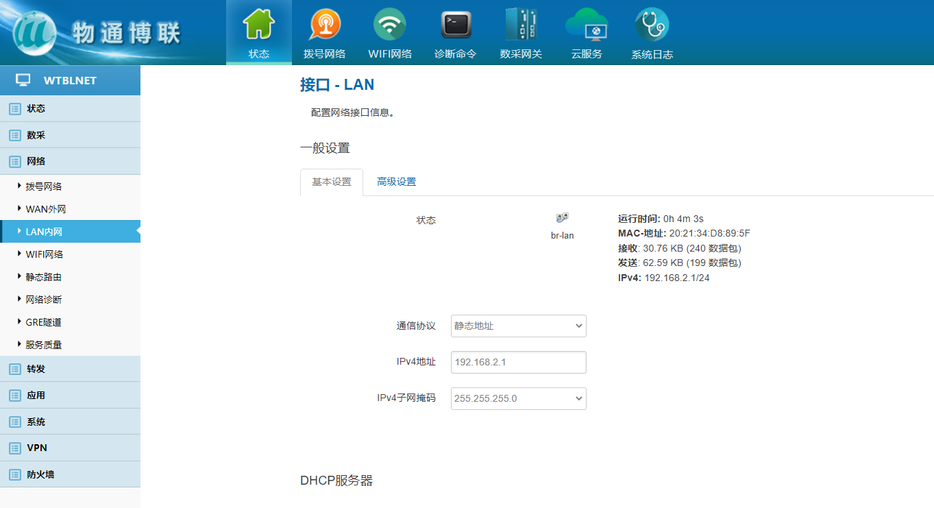 下载中心 视频中心 常见问题 售后服务 工业网关 设备快线 数据云平台 联网设备 问答百科 如何修改工业智能网关的LAN口IP地址? 时间:2022-10-26 09:06:09 点击:5147 关键词:工业智能网关,LAN口 问题:如何修改工业智能网关的LAN口IP地址? 回答: (1)电脑直连网关,确保电脑与网关处于同网段或者自动获取 浏览器里面输入192.168.2.1 (2)登陆网关配置界面 默认用户名/密码:admin/123456 (2)选择网络——Lan内网——更改IPV4地址、子网掩码,保存应用 (3)注意电脑本机IP地址是否与更改地址处于同网段(自动获取需重新拔 插网线) (4)浏览器输入更改后的IP地址登陆到网关配置界面即修改成功 上一篇:工业智能网关和DTU有什么区别吗? 下一篇: 工业智能网关需要另外配4G路由器吗?