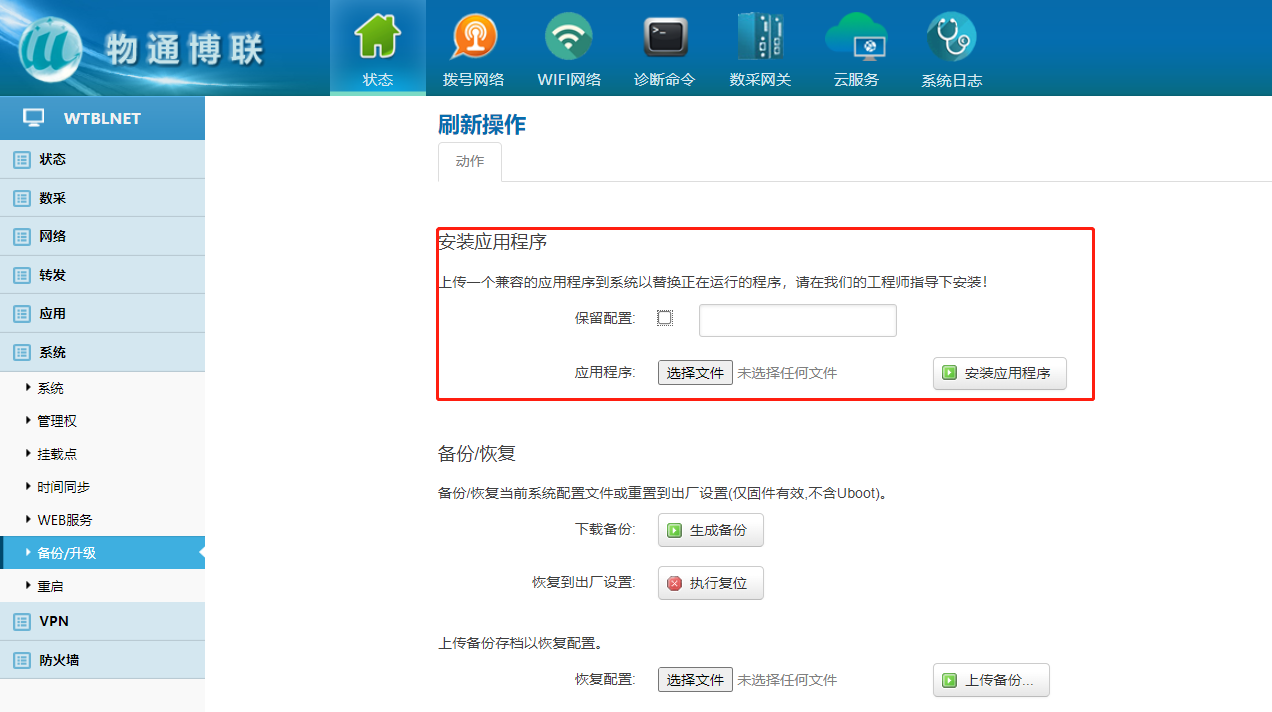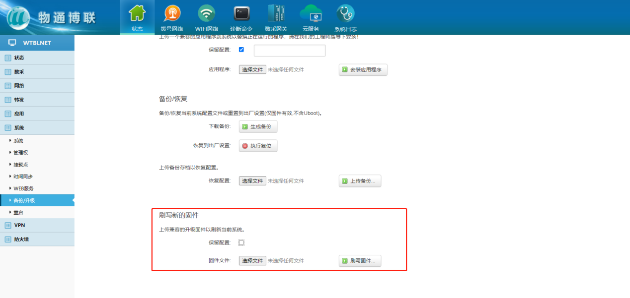 下载中心 视频中心 常见问题 售后服务 工业网关 设备快线 数据云平台 联网设备 问答百科 工业智能网关如何更新程序和固件? 时间:2022-10-26 09:39:53 点击:5393 关键词:工业智能网关,网关配置,固件升级 问题:工业智能网关如何更新程序和固件? 回答: (1)固件升级:后缀为。bin的文件 点击系统—备份/升级—选择文件—刷写程序(不保留配置) (2)IPK文件升级:后缀为。ipk的文件 点击系统—备份/升级—选择文件—输入密码—安装应用程序(不保留配置) 上一篇:工业智能网关时间如何进行同步? 下一篇: 工业智能网关如何连接wifi热点?