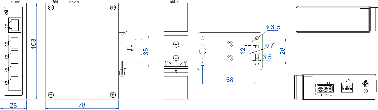 外壳:IP40防护等级,金属外壳 安装:DIN导轨式或壁挂式安装 尺寸(宽×高×深):28mm×103mm×78mm  |