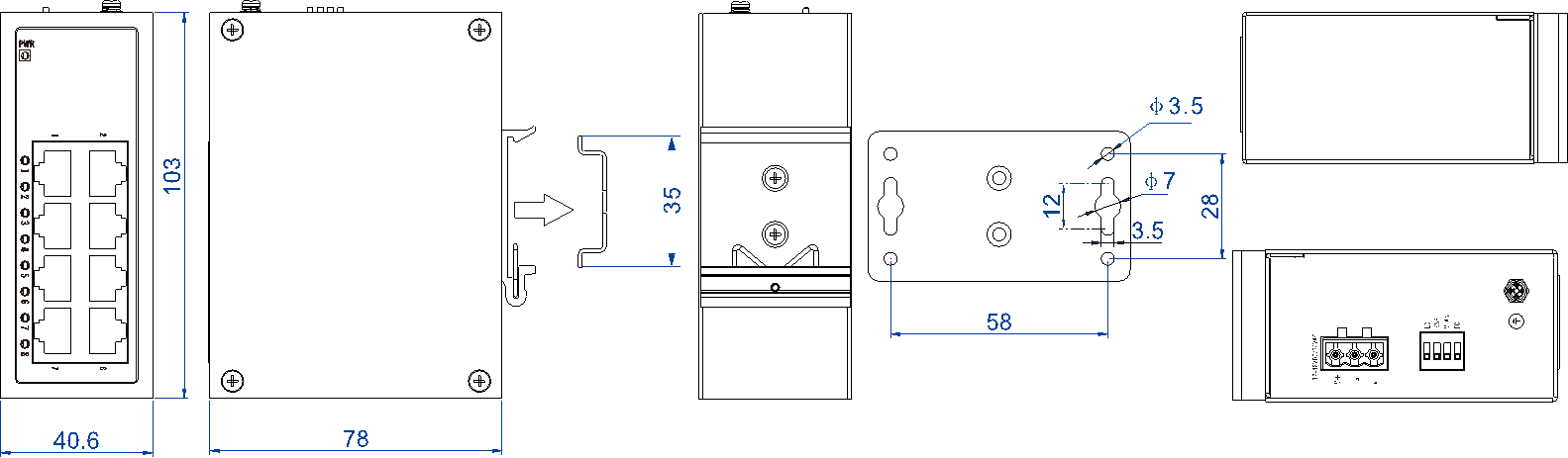 外壳:IP40防护等级,金属外壳 安装:DIN导轨式或壁挂式安装 尺寸(宽×高×深):40.6mm×103mm×78mm  |