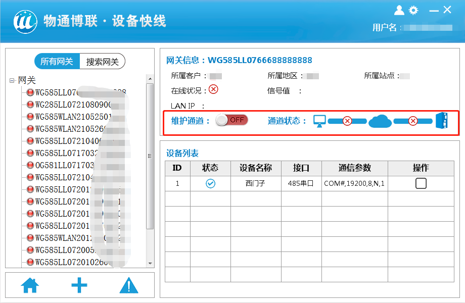 选择选择一台需要维护的在线网关,点击建立通道,等到通道状态都是绿色打钩后就证明通道建立完成,以太网设备可以通过ping来测试通道情况。