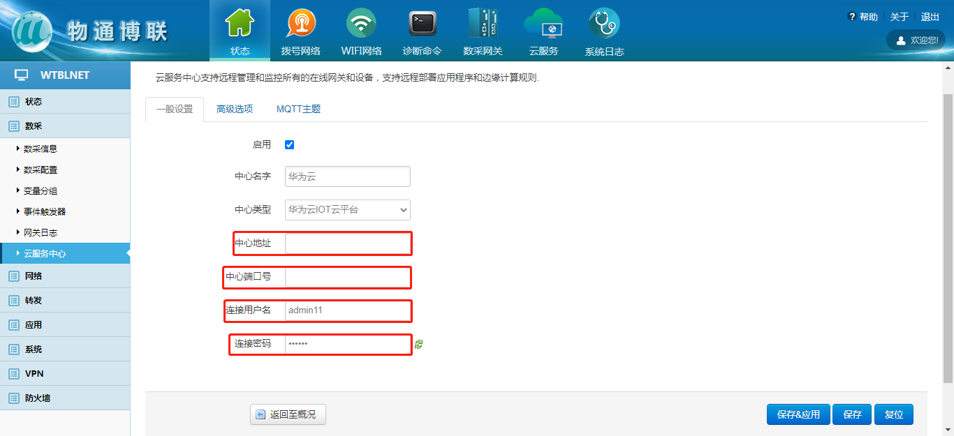 登录物通博联工业网关配置界面,填写相关连接参数,配置内容,即可将数据上传至华为云IOT设备接入模型中(每种不同的第三方接入云,都有详细的配置手册)