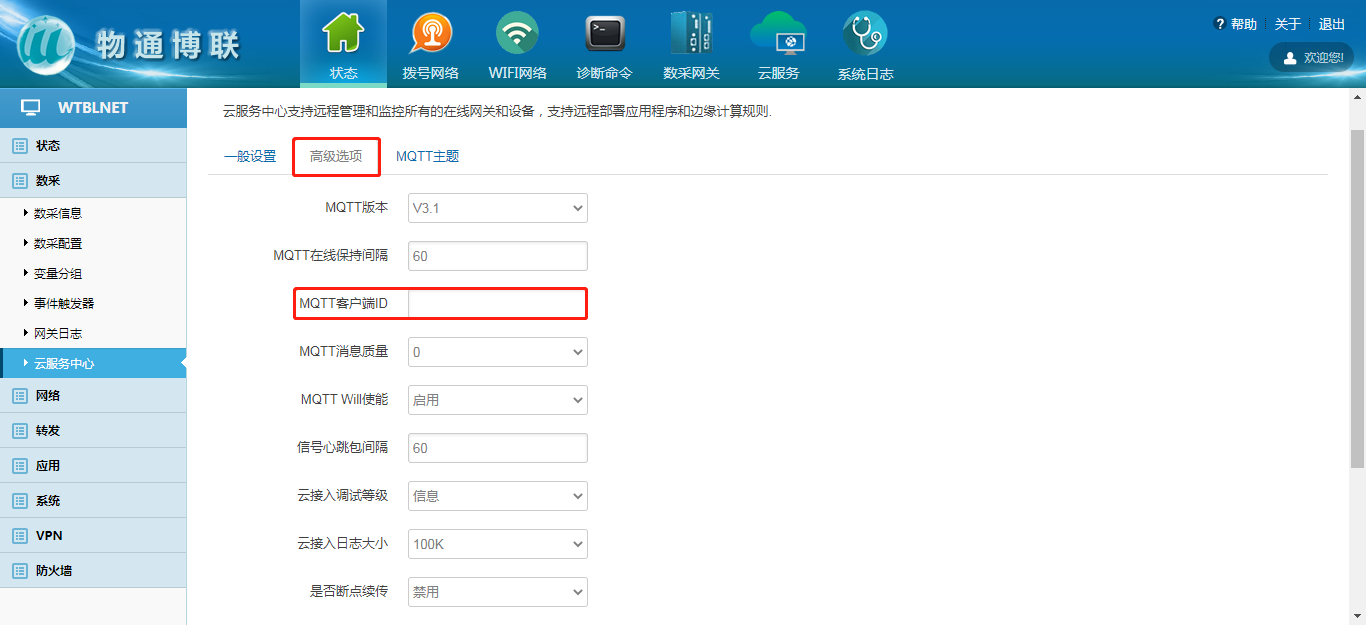 在高级选项中配置MQTT客户端ID连接参数,填写完毕后保存并应用;