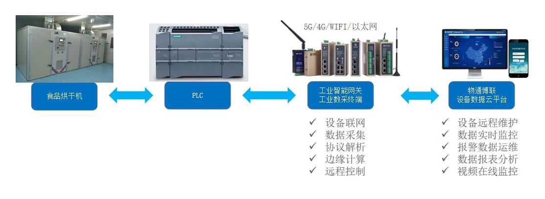 为解决这些问题,物通博联提供以工业智能网关为中心构建的粮食烘干机远程监控智能管理系统。通过将粮食烘干机的控制器PLC接入网关,实时采集设备运行状态、工艺参数、报警信息等数据。这些数据经由5G/4G/WIFI/以太网等通信方式上传至设备运维管理平台,实现对粮食烘干机的远程集中监控与智能化管理。