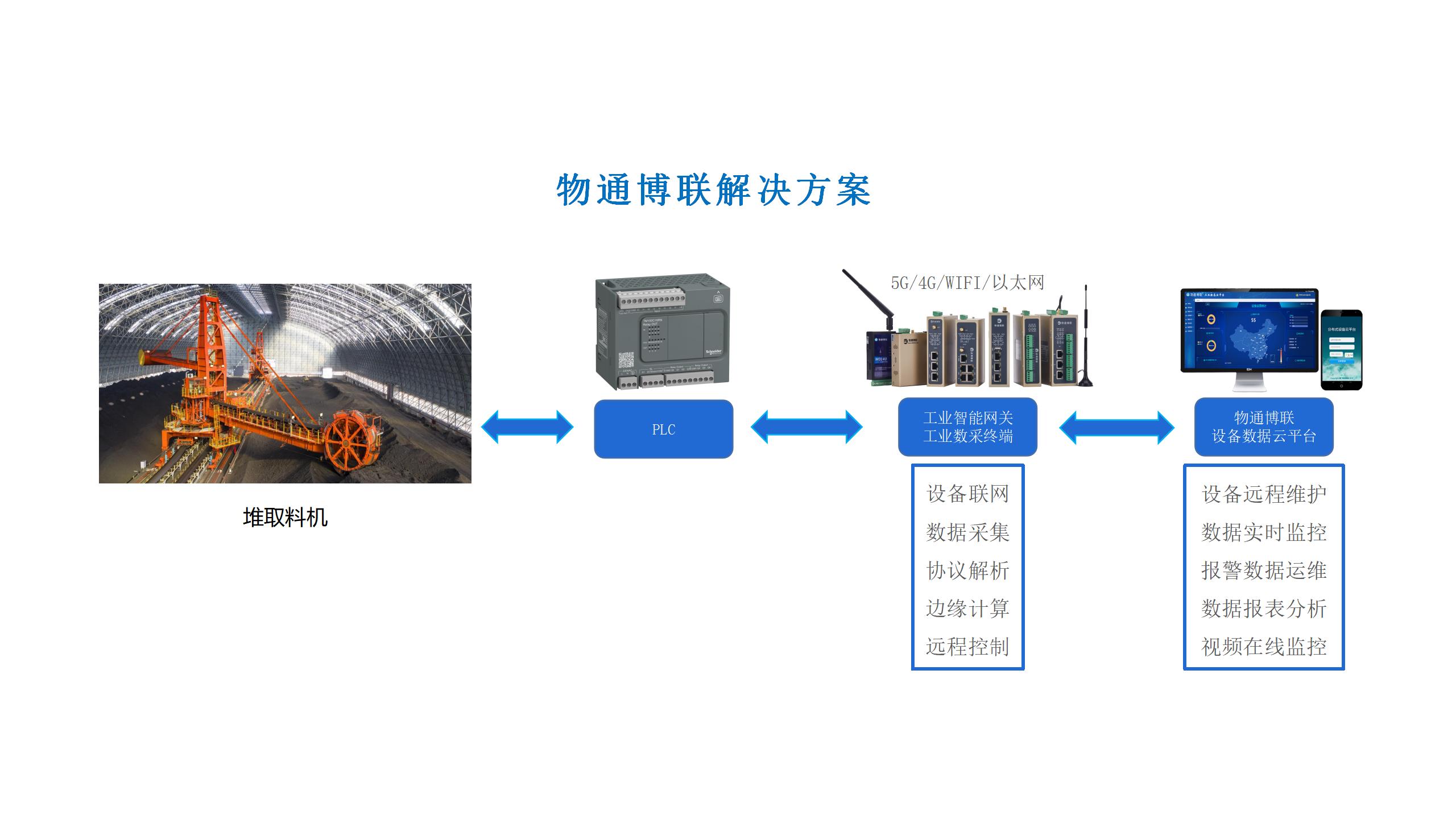 现场堆取料机分布在圆堆厂房以及长堆厂房内,分布较散。同时设备经常移动且环境负责,导致有线通信的方式效果差且易磨损,出现异常告警往往无法定位到设备本身或是通信故障,带来严重的生产隐患与事故风险,成为影响生产安全的重要因素之一。