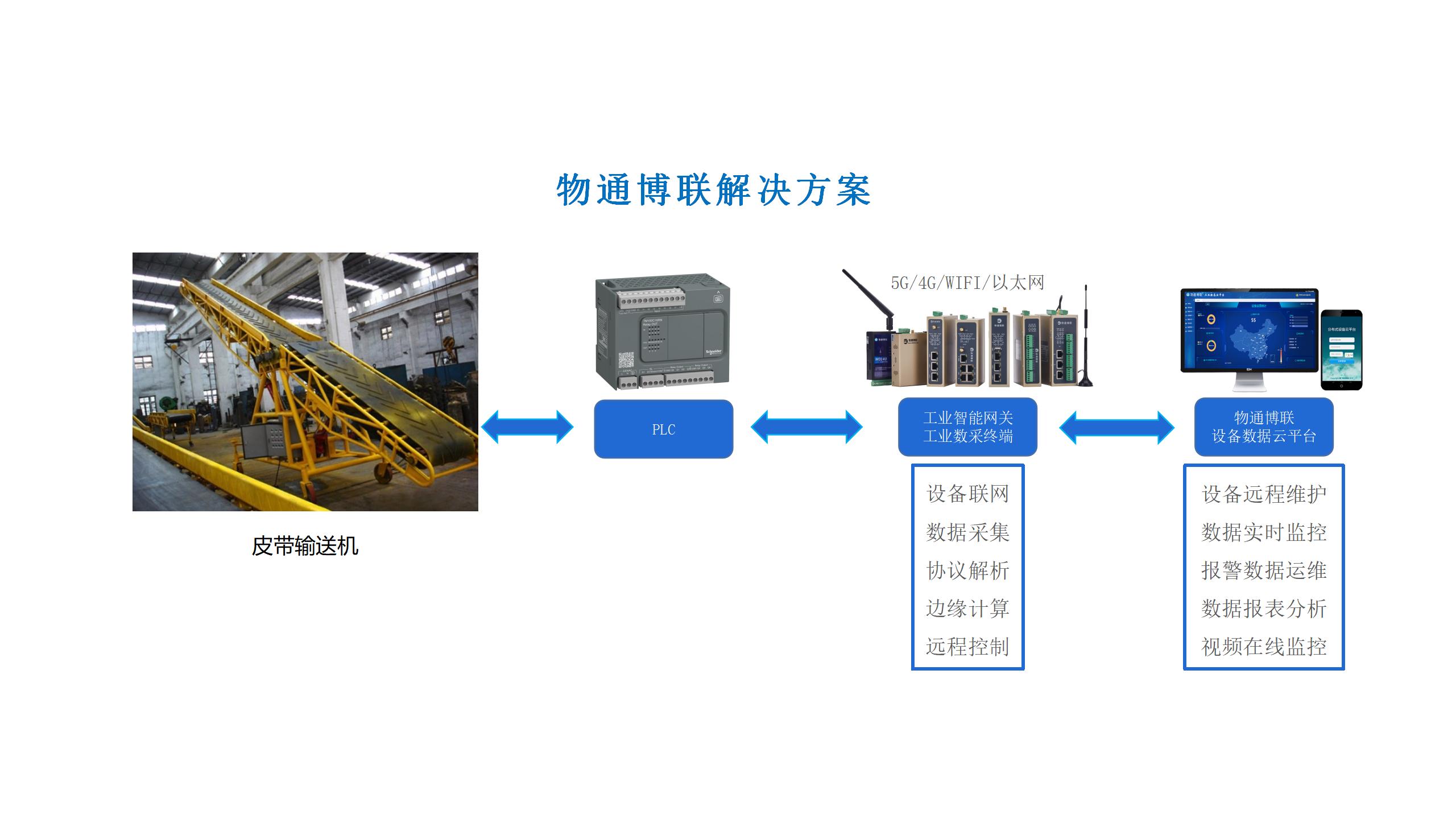 通过接入控制器PLC及告警灯,工业无线数采网关实时采集设备开关、电压电流、是否告警等信息,并通过5G/4G等方式对接到监控中心平台中,从而远程监控全厂各处皮带输送机的告警状态,并在出现异常时进行远程控制启停设备,避免出现意外事故。