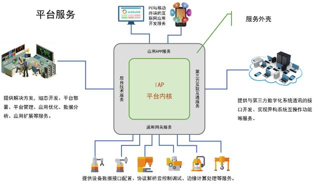 为此,必须要有一种操作系统性质的基础软件来维持这样的关系,并且能够适应这种关系可能发生的各种变化。图2是在工业互联网4层架构基础之上建立的一种新的体系架构表达形式。其中,工业互联网内核包含了大量的计算资产,它们的作用是对工业互联网的数据进行处理,并将处理结果返回工业系统中的管理者与生产者,以及对应的工业设备。我们把具有这种特征的内核称为一种平台。在平台的外部包裹着一圈软件服务资产,分别提供:工业互联网与工业设备之间的数据通讯服务,工业互联网开发、部署、运维等后台支持服务,工业APP数据通讯服务,以及工业互联网与其它信息技术系统的第三方数据通讯服务。总之,这里所谓软件服务资产本质上就是一组与平台外的信息系统维持数据通讯的功能???。