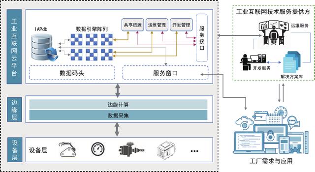 鉴于以上分析,我们提出一种面向服务的工业互联网的架构设计,如图4所示。其中,工业互联网的核心部分是云平台,除了数据库和数据引擎阵列外,需要部署共享资源、运维管理和开发管理三个基本服务模块。工厂设备的数据经过边缘层后送入云平台的数据码头进行缓存处理。云平台的服务窗口用于工厂管理和生产各项应用的响应,即应用的可视化窗口。作为工业互联网的第三方,技术服务提供方的主要任务包括与企业用户连接,处理企业的应用需求,调用解决方案库,提供应用开发服务。另外通过云平台的服务接口,获取工业互联网运行状态信息,提供运维管理,确保工业互联网与企业生产管理过程保持同步。