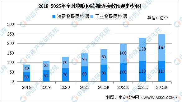 在全球范围内,物联网终端数量高速增长。截至2019年,全球物联网设备连接数量达到110亿个,其中消费物联网终端数量达到60亿,工业物联网终端数量达到50亿。根据GSMA的预测,2025年全球物联网终端连接数量将达到250亿个,其中消费物联网终端连接数量达到110亿,工业物联网终端连接数将达到140亿,占全球连接的一半以上。