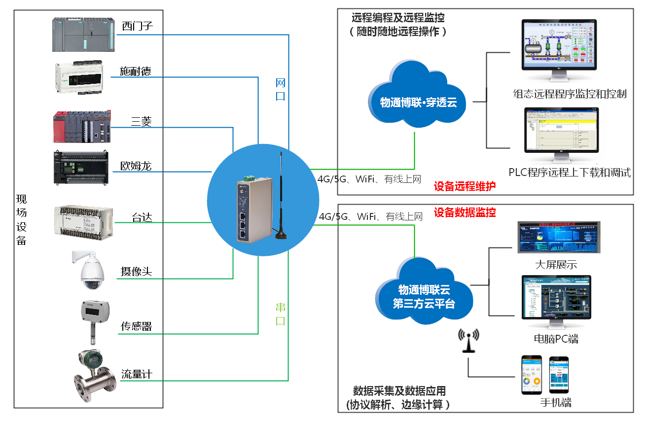 物通博联5G工业网关通过与现场设备连接,实现现场设备的设备联网、数据采集、协议解析、边缘计算,将数据标准化后通过MQTT等方式上传到污水预处理智能化信息应用平台,实现设备管理、数据监控、故障报警、远程维护等功能,实现污水处理智能化、数据化、便捷化。