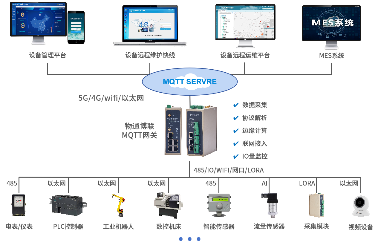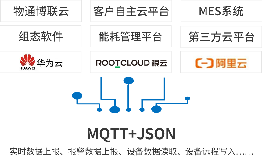 北向支持MQTT协议接入物通博联云平台,客户自主开发的云平台,第三方云平台(根云、美云、华为、阿里、百度、微软等IOT云平台),组态软件、MES系统、ERP系统等工业软件