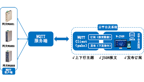网关内嵌MQTT客户端,它建立与部署在服务器上的MQTT Broker的双向通信链路;同时客户自行开发的云平台(或本地软件)也是通过MQTT客户端来和MQTT Broker来实现订阅和发布数据的双向通信。