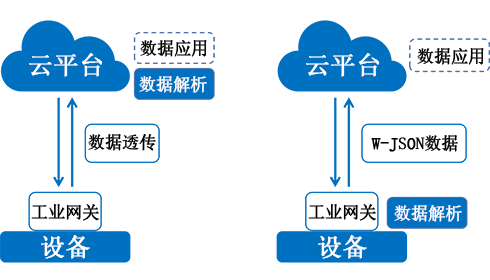 边缘解析:针对网关内嵌有驱动的设备,直接采用边缘解析和标准化后的W-JSON格式数据上传到云端入库