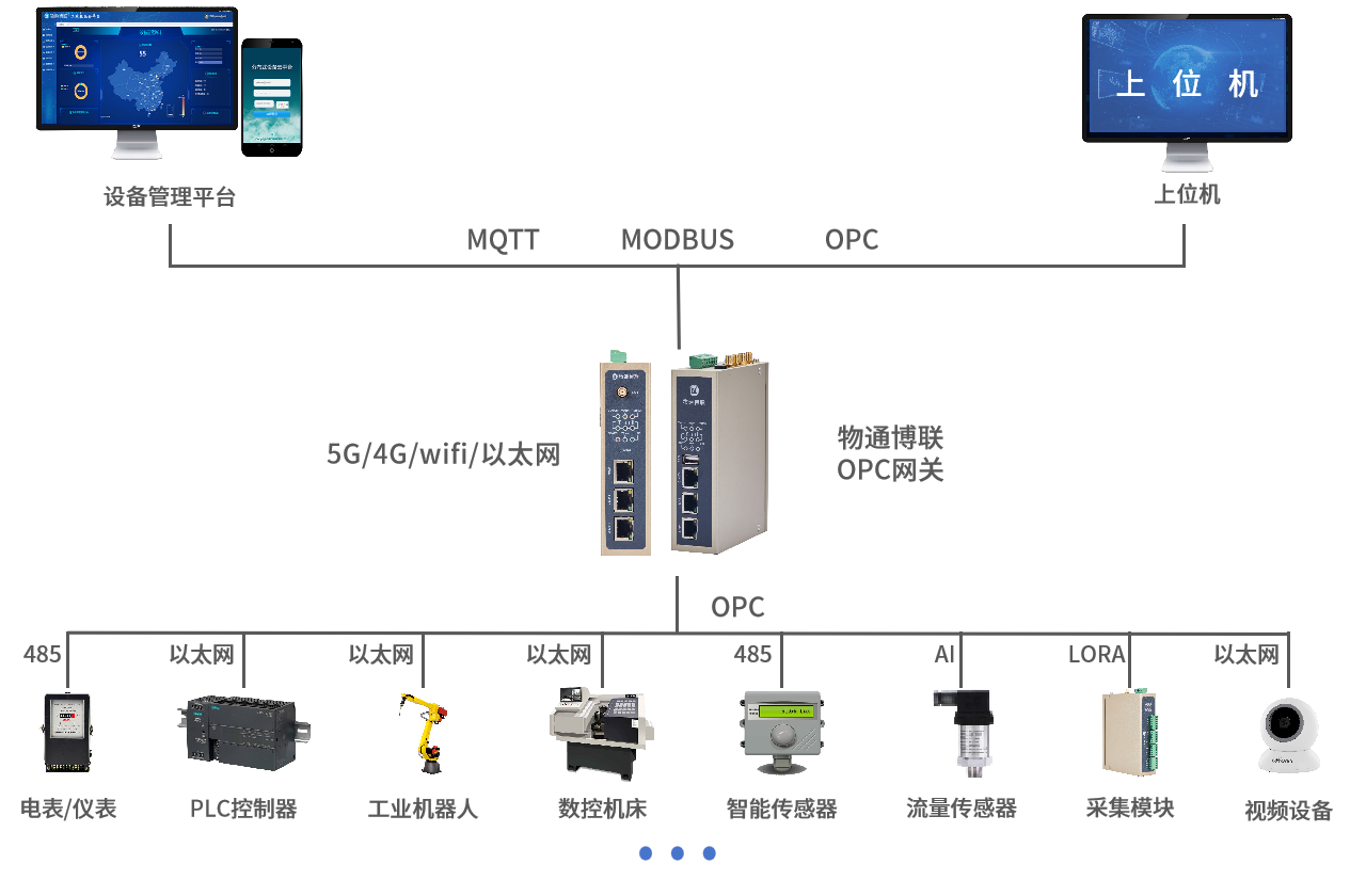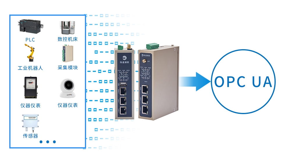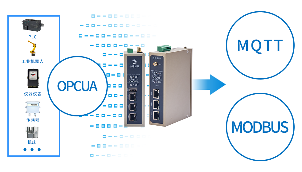 物通博联OPC网关具有设备联网、数据采集、协议解析、边缘计算、云端接入等功能,支持OPC UA协议解析数据采集,能够连接到PLC、仪器仪表、传感器、数控机床、DCS、SCADA等,实时采集数据并通过Modbus/MQTT协议传输到云平台或本地上位机,支持采集设备数据通过OPC UA协议转发给组态软件、上位机软件、云平台,实现设备远程监控、远程管理。