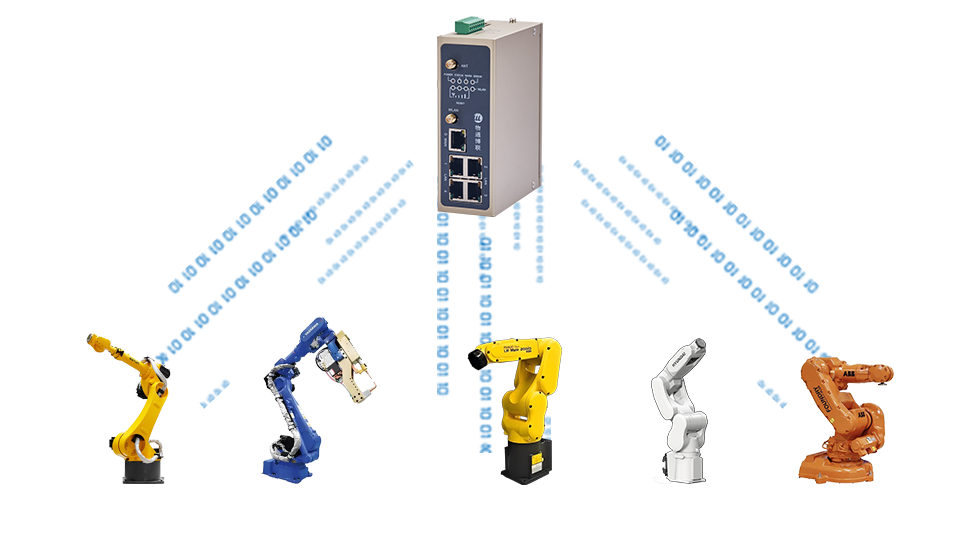 物通博联机器人数采网关支持采集市面上大部分的机器人(机械手臂)设备(发那科、ABB、现代、安川、埃斯顿……等等)的运行状态、工艺参数、故障信息、生产数据等数据,将数据接入工厂的MES系统、工厂的加工系统、数据库及物联网系统物通博联云平台、设备管理平台等,实现机器人设备的远程监控和运维,生产优化与数据分析,有助于提高生产效率、降低成本、保障生产安全。