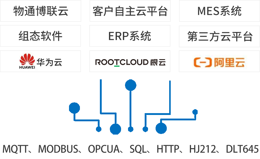 北向支持接入物通博联云平台,客户自主开发的云平台,第三方云平台(根云、美云、华为、阿里、百度、微软等IOT云平台),组态软件、MES系统、行业监控平台等工业软件