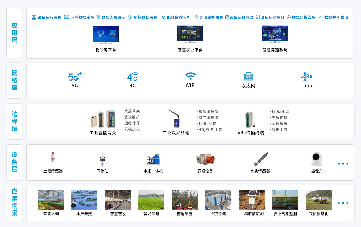 物通博联构建了 “终端感知 - 边缘传输 - 云端中枢 - 应用赋能” 全链路智慧农牧技术架构:以工业智能网关、工业数字终端为核心边缘接入层设备,实现对农机作业设备(如播种机、收割机、水肥一体机等)、养殖环控设备(如饲喂机、通风系统等)、环境监测传感器(如温湿度、氨气传感器、光照传感器等)等多类型终端设备的标准化数据采集与协议解析;通过稳定的边缘计算与网络传输能力,将设备运行数据、环境参数数据实时上传至物联网云平台;在云端中枢层,依托采集的数据构建农牧生产全场景数字化看板,进而实现对终端设备的远程状态管理、异常工况自动故障报警、设备启停远程控制及运行参数精准远程调优,最终为农牧行业提供从设备联网到智能运营的一体化智慧解决方案,助力传统农牧向数字化、智能化转型。
