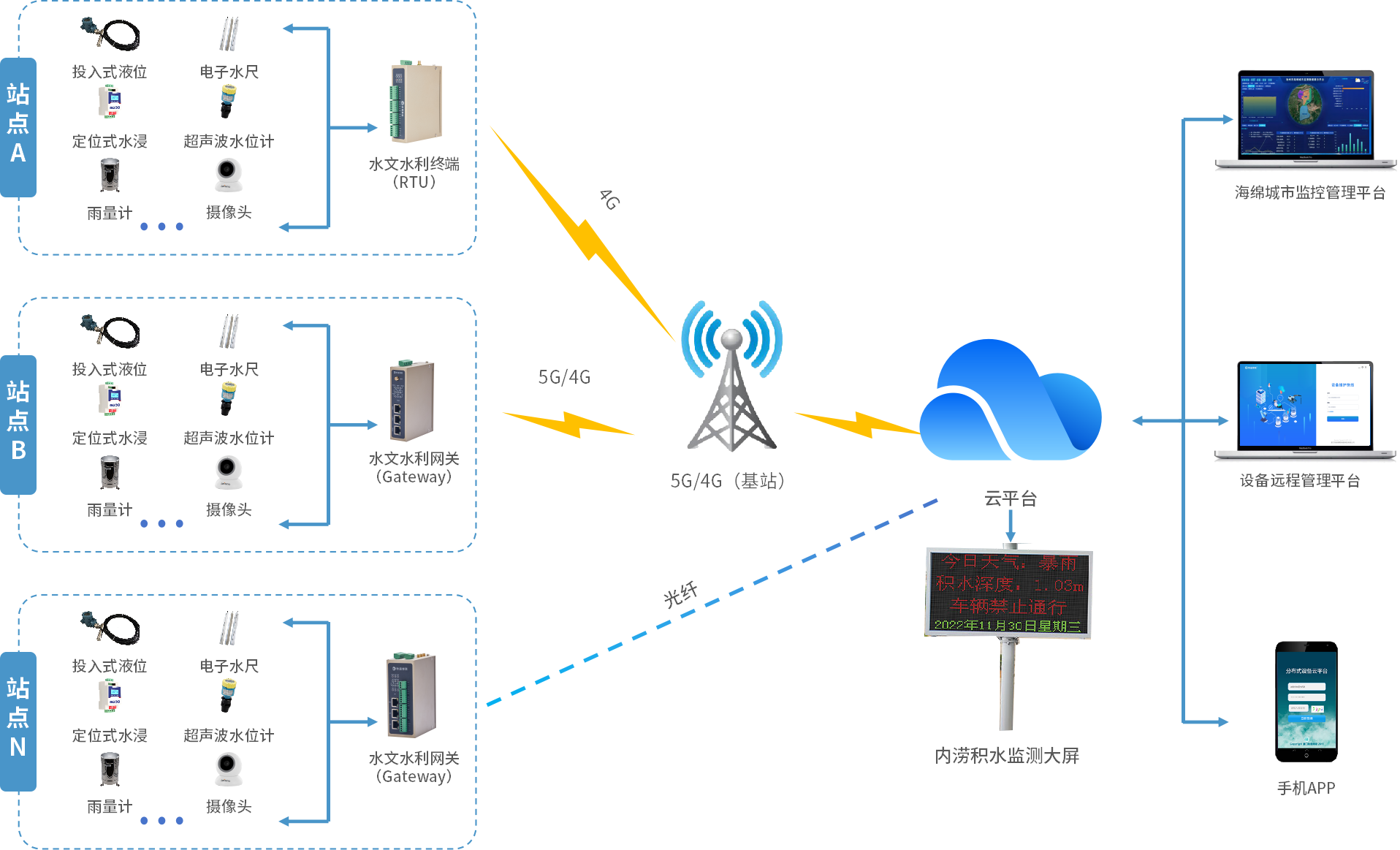 实时监测水位、液位高低、雨量、流速等参数,可设置监测频率,24小时不间断运行,可以通过手机端、PC端、数据大屏等实时监测城市内涝积水状态和视频画面。