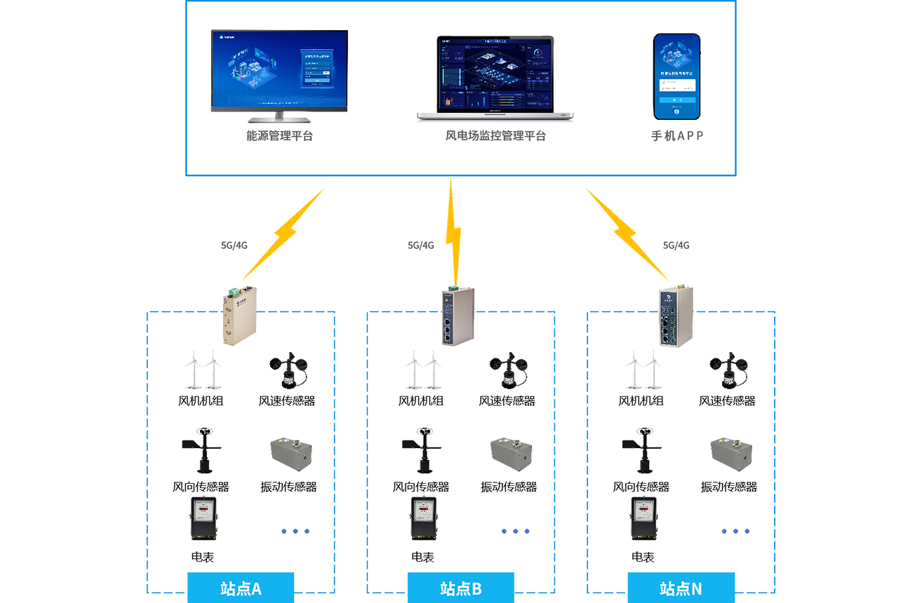 通过物通博联的工业智能网关采集风力发电场的每台风机和风速传感器、风向传感器、振动传感器等设备,将采集到的风机运行数据(如转速、功率、温度等)传输至风电场监控管理平台。平台对数据进行实时分析,监测风机运行状态,当检测到故障或异常时及时发出预警,并提供故障诊断和维修建议。同时支持远程控制风机启停、调整参数等操作,以及优化发电调度。