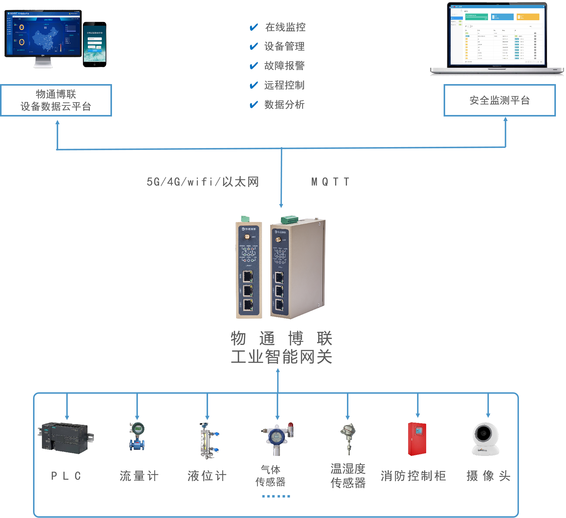 物通博联工业智能网关支持接入液位计、流量计、温湿度传感器、气体传感器及消防控制柜PLC等设备,实时采集液位、流量、温湿度、危险气体浓度及消防柜运行状态等数据,并通过5G/4G/WIFI/以太网的方式对接到油库储量安全监测平台或国家监管中心内,快速搭建分布式多站点的监控网络,操作简单、配置方便。