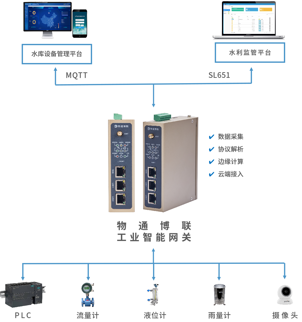 通过平台下发控制命令到网关可以远程控制现场设备,例如通过对接闸门PLC控制,可实现远程开关闸门、监测闸门状态等,实现自动化运行。