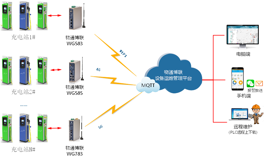 6、远程维护:通过物通博联设备维护快线,可以对现场充电桩设备进行远程调试、远程诊断、远程上下载程序,提高维护效率,降低维护成本。