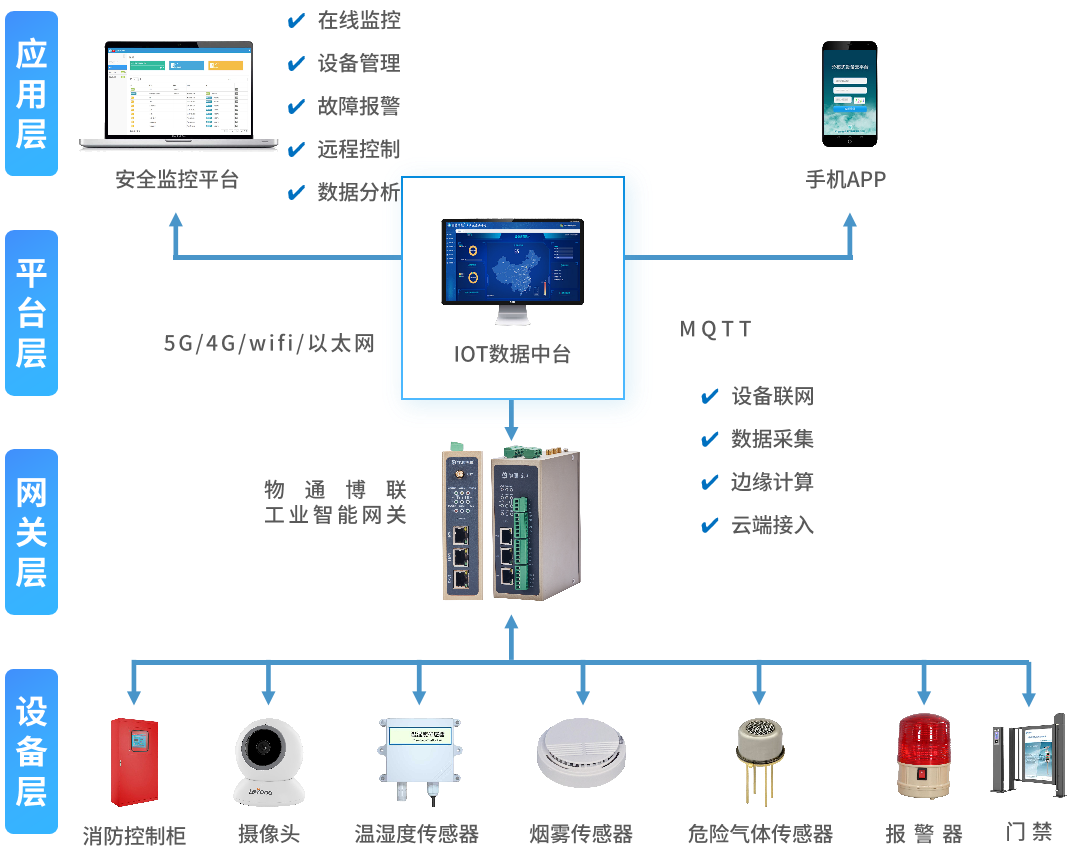物通博联推出的化工安全监控预警系统集成了物联网技术、大数据分析、云计算等技术,实现对化工生产、仓储、运输全过程的实时监控和及时预警。通过将温湿度传感器、危险气体传感器、压力计、PLC等设备接入到物通博联工业智能网关中,实时采集设备参数并通过5G/4G网络上传到物通博联IOT数据中台,并将数据转发给企业监控平台或国家监管平台。