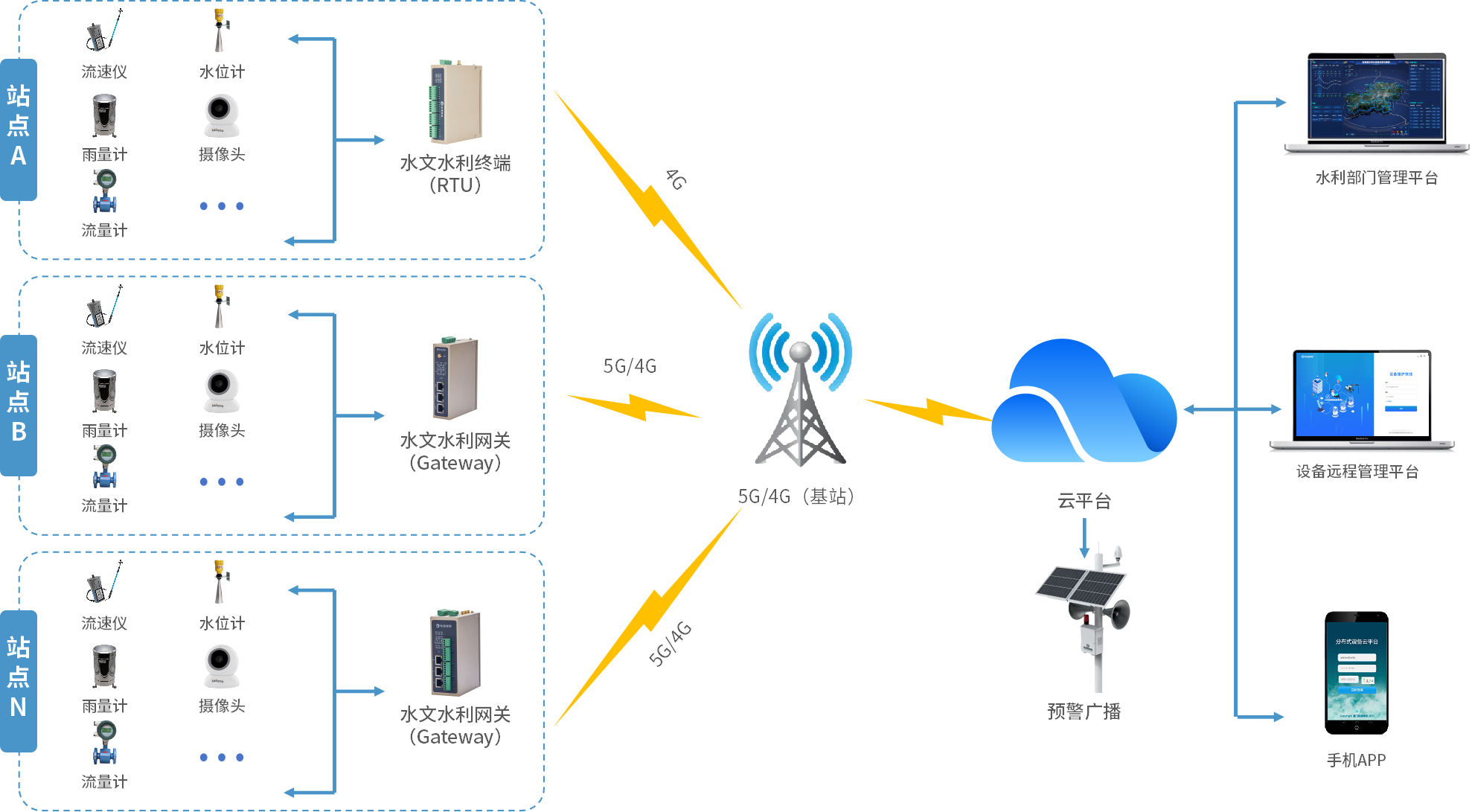 物通博联提供中小流域防汛防洪监测预警系统解决方案。通过将水位计、流量计、雨量筒接入水利水文网关(RTU),实时采集水位、流量、雨量等数据并通过 4G/5G等多种通讯方式实现传输汇聚到各级中小河流治理信息化管理平台,搭建起一张完整、精准、实时的水文监测网络,提供准确有效的防洪防汛预报预警,便于形成预案应对、灾害预演等数字化治理手段,加强中小流域防汛防洪治理水平与响应能力。