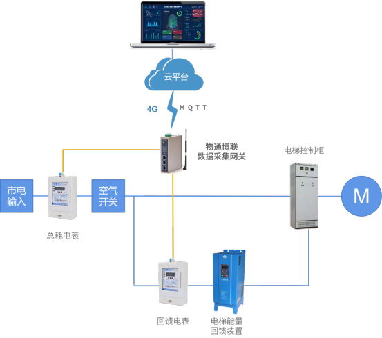 物通博联楼宇电梯节能项目远程监控系统,通过物通博联数据采集网关与现场的电表连接(一般为2个电表,一个是在空气开关前的市电输入电表,采集电梯耗电量,一个是电梯能量回馈装置出线位置的电表,采集电梯能量回馈装置发电量),网关采集电表数据通过4G上网,发送到客户自主监控平台软件,在平台软件上对数据进行分析计算,分析得出电梯的节电率和节能情况。