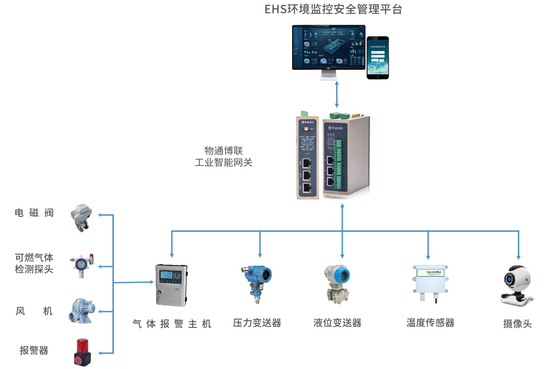 现场可燃气体探测主机为RS485串口,通过接入物通博联工业智能网关,能够实时采集液位、压力、温度等数据,并通过工厂局域网对接到EHS环境监控安全管理平台中,从而实现车间各点位环境参数的实时监控、超限告警、在线管理等,及时采取措施管理控制,保证车间环境安全,避免出现意外事故与经济损失。