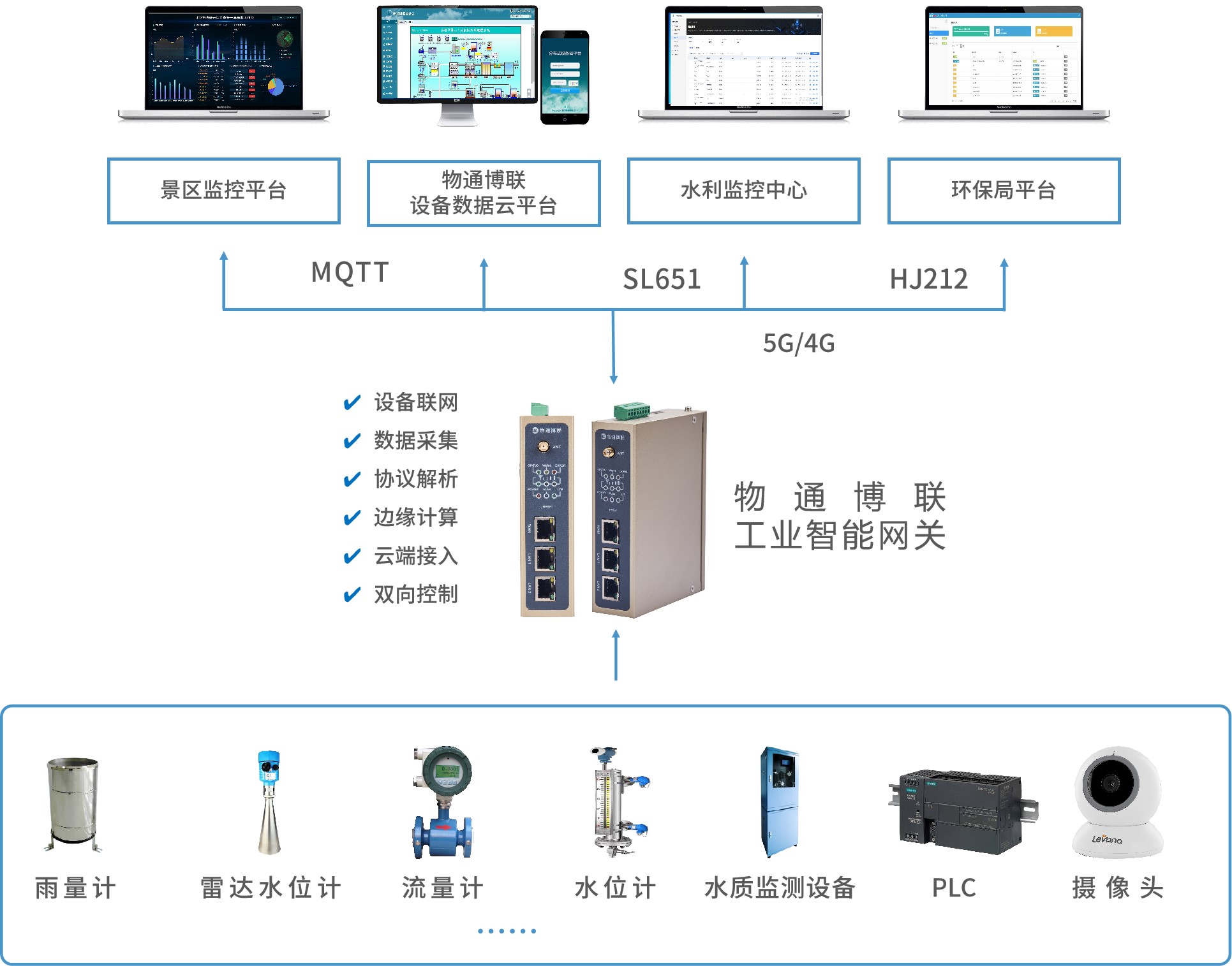 采集水位、降雨量、流量、水质、浊度、视频等多维度数据,并通过无线网络5G/4G传输到景区管理平台和水利管理平台中进行实时监控。